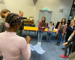 Wir starteten mit einer kurzen Kennenlern-Runde – der Austausch war an diesem Nachmittag ebenso wichtig wie die Inhalte. Danach haben die Teilnehmer:innen von Influencer @consty viel über seinen Alltag mit TikTok & YouTube erfahren und auch selbst einige Zeichnungen und Tricks ausprobiert. In der Zwischenzeit widmete sich eine Gruppe an Mädchen mit Poetryslammerin Yasmo den Slogans für eine neue Plakatserie.