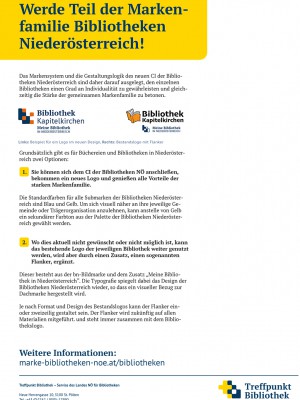 Es freut uns sehr, dass wir bereits viele Anfragen zur neuen Markenfamilie Bibliotheken Niederösterreich erhalten haben! Wir arbeiten mit viel Elan und Energie an der Umsetzung und Ausrollung unserer neuen CI. Wer noch keine Zeit hatte – unbedingt auf die Markenhomepage schauen. Diese wird auch laufend mit neuen Vorlagen befüllt, die man sich einfach downloaden kann.